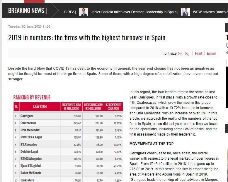 Garrigues continues to be, once again, the overall winner with respect to the legal market turnover figures in Spain. From €243.40 million in 2018, it has gone up to 276.80 in 2019. In this sense, the firm is emphasizing the area of Mergers and Acquisitions in Spain in 2019. “Garrigues leads the ranking of legal advisors in Mergers and Acquisitions in 2019 both by number of transactions and by value."The firm,” they say on their website, “closed a total of 136 operations in Spain in the year, for a total value of €17.99 billion (20% of the total registered in the country), according to the annual report of Business Intelligence platform TTR. Furthermore, according to the report mentioned above, in 2019 Garrigues participated in 10 more operations than in 2018.” With an increase of 13.74% in its annual turnover, Cuatrecasas is increasingly close to the top of this ranking. Everything indicates that 2019 was a good year for the Catalan firm, which last year earned some €33 million more than in 2018. In this regard, the firm’s best operation was its advice to the French group Elior on the sale of its subsidiary Areas to the venture capital fund PAI Partners for €1.54 billion in April 2019.