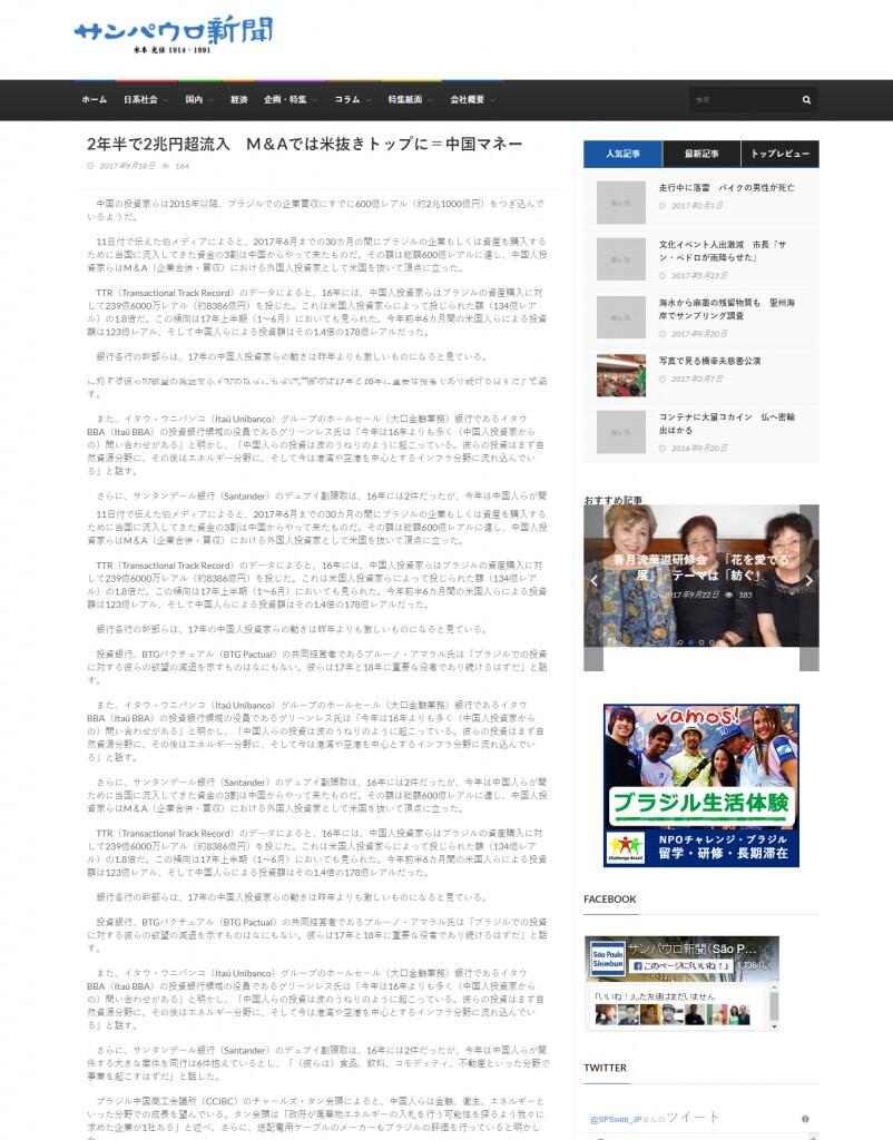 11日付で伝えた伯メディアによると、2017年6月までの30カ月の間にブラジルの企業もしくは資産を購入するために当国に流入してきた資金の3割は中国からやって来たものだ。その額は総額600億レアルに達し、中国人投資家らはM&A(企業合併・買収)における外国人投資家として米国を抜いて頂点に立った。