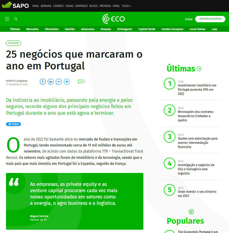 O ano de 2022 foi bastante ativo no mercado de fusões e transações em Portugal, tendo movimentado cerca de 11 mil milhões de euros até novembro, de acordo com dados da plataforma TTR – Transactional Track Record. Os setores mais agitados foram do imobiliário e da tecnologia, sendo que o mais país que mais investiu em Portugal foi a Espanha, seguido da França.
