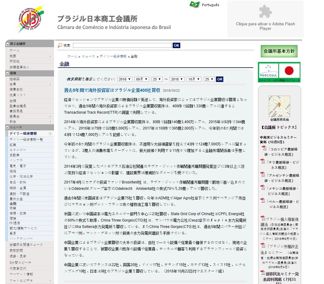 中国企業に次いでフランスは22社、英国20社、ドイツ17社、オランダ15社、カナダ13社、スイス11社、ルクセンブルグ10社、日本は9社のブラジル企業を買収している。(2018年10月22日付けエスタード紙)
