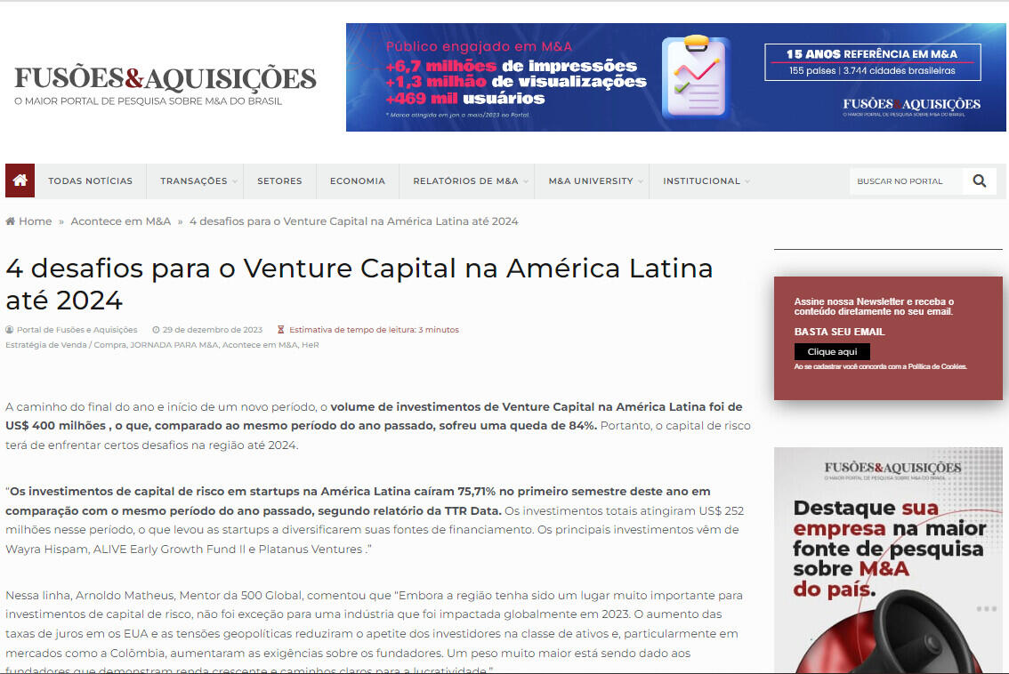A caminho do final do ano e início de um novo período, o volume de investimentos de Venture Capital na América Latina foi de US$ 400 milhões , o que, comparado ao mesmo período do ano passado, sofreu uma queda de 84%. Portanto, o capital de risco terá de enfrentar certos desafios na região até 2024.
