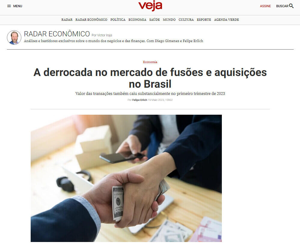 O Brasil registrou 370 acordos de fusões e aquisições no primeiro trimestre de 2023, uma queda de 46% em comparação com o mesmo período do ano anterior. As negociações mobilizaram un montante de 4,7 billhões de dólares (23,4 billhões de reais), uma queda de 65%, na mesma base de comparação. A derrocada desses processos observada no Brasil ocorre de maneira semelhante em toda a América Latina. O continente teve 604 acordos de fusões e aquisições no primeiro trimestre, 39% a menos que nos três primeiros meses de 2022. Já o montante agregado diminuiu 69% na região, a 7,9 billhões de dólares (39,3 billhões de reais hoje). Os dados são da consultoria britânica Aon com base em um relatório da TTR Data.