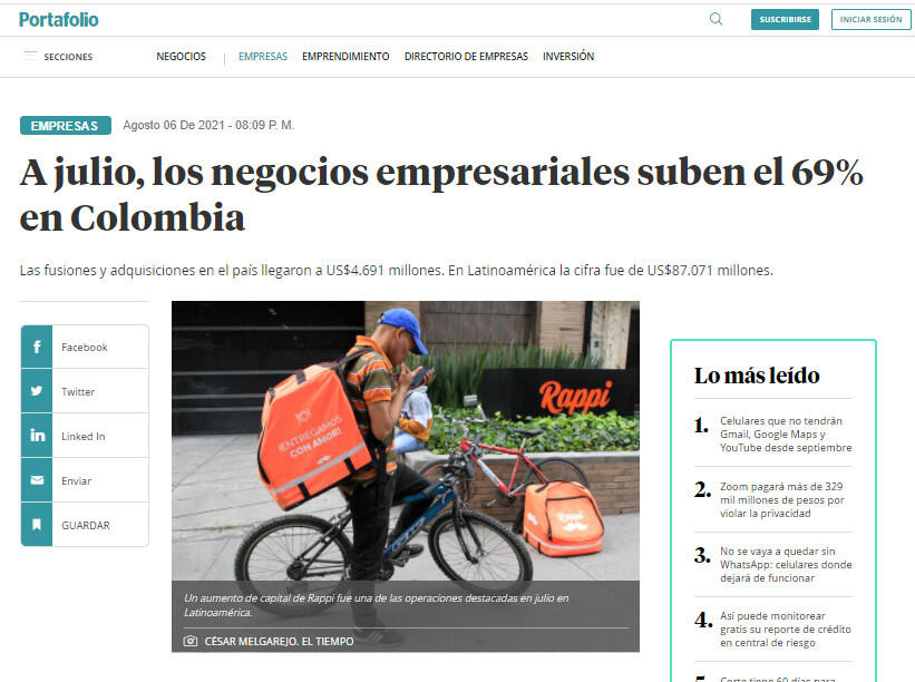 En cuanto a los negocios y operaciones empresariales destacadas en julio TTR señaló que se presentó como la tercera más importante de Latinoamérica una de Rappi Colombia por US$500 millones en la que participaron Andreessen Horowitz, Baillie Gifford, DST Global, GIC, Octahedron Capital, Sequoia Capital, SoftBank Group, T. Rowe Price, Third Point, así como Y Combinator. Esas firmas son de Hong Kong, Japón, Singapur, Reino Unido y Estados Unidos.