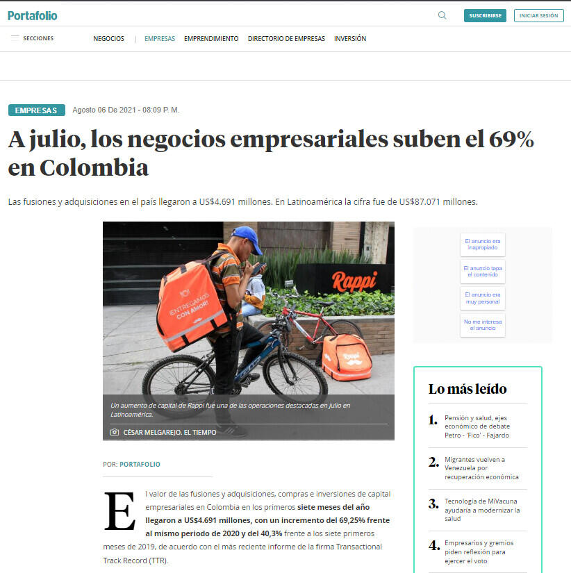 En cuanto a los negocios y operaciones empresariales destacadas en julio TTR señaló que se presentó como la tercera más importante de Latinoamérica una de Rappi Colombia por US$500 millones en la que participaron Andreessen Horowitz, Baillie Gifford, DST Global, GIC, Octahedron Capital, Sequoia Capital, SoftBank Group, T. Rowe Price, Third Point, así como Y Combinator. Esas firmas son de Hong Kong, Japón, Singapur, Reino Unido y Estados Unidos.