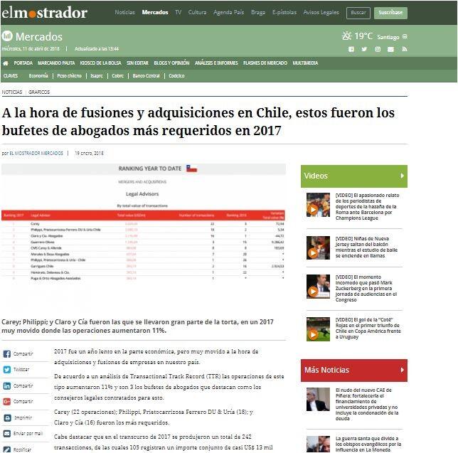 A la hora de fusiones y adquisiciones en Chile, estos fueron los bufetes de abogados más requeridos en 2017 Carey; Philippi; y Claro y Cía fueron las que se llevaron gran parte de la torta, en un 2017 muy movido donde las operaciones aumentaron 11%.