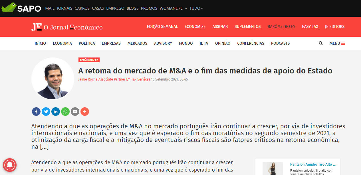 Assim, e apesar dos sinais de otimismo verificado no mercado de M&A, é importante relembrar que ainda não é possível antecipar o fim desta crise e de extrema importância planear e otimizar a carga fiscal das Empresas, nomeadamente através da obtenção de novos benefícios fiscais que permitam as empresas não reduzir o seu rácio de liquidez. Por outro lado, e num cenário de desinvestimento, motivado pelo aquecimento do mercado português de transações que se espera nos próximos meses, é absolutamente crítico que as empresas se antecipem com a realização de trabalhos de revisão de procedimentos internos, que permitam antecipar e mitigar riscos do negócio, os quais poderão impactar negativamente a valorização das empresas no âmbito de futuras transações.