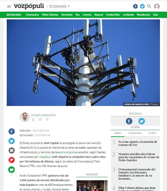 El fondo australiano AMP Capital ha encargado al banco de inversión Greenhill & Co la puesta en marcha de la venta de Axión, operador de infraestructuras y servicios de telecomunicaciones español, según fuentes consultadas por Vozpópuli. AMP adquirió la compañía hace cuatro años por 154 millones de dólares, según los datos de Transactional Track Record (TTR), unos 135 millones de euros.