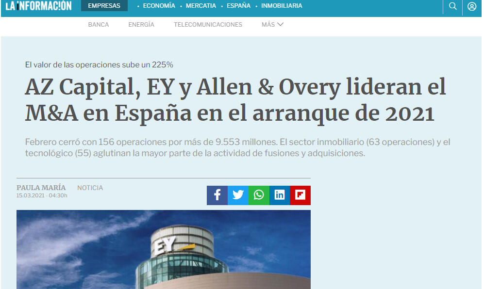 AZ Capital, EY y Allen & Overy lideran el M&A en España en el arranque de 2021