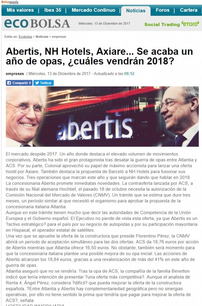Abertis, NH Hotels, Axiare... Se acaba un año de opas, ¿cuáles vendrán 2018?