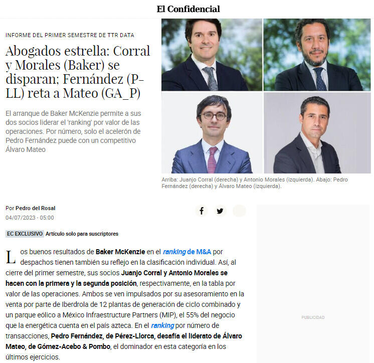 Los buenos resultados de Baker McKenzie en el ranking de M&A por despachos tienen también su reflejo en la clasificación individual. Así, al cierre del primer semestre, sus socios Juanjo Corral y Antonio Morales se hacen con la primera y la segunda posición, respectivamente, en la tabla por valor de las operaciones. Ambos se ven impulsados por su asesoramiento en la venta por parte de Iberdrola de 12 plantas de generación de ciclo combinado y un parque eólico a México Infraestructure Partners (MIP), el 55% del negocio que la energética cuenta en el país azteca. En el ranking por número de transacciones, Pedro Fernández, de Pérez-Llorca, desafía el liderato de Álvaro Mateo, de Gómez-Acebo & Pombo, el dominador en esta categoría en los últimos ejercicios.