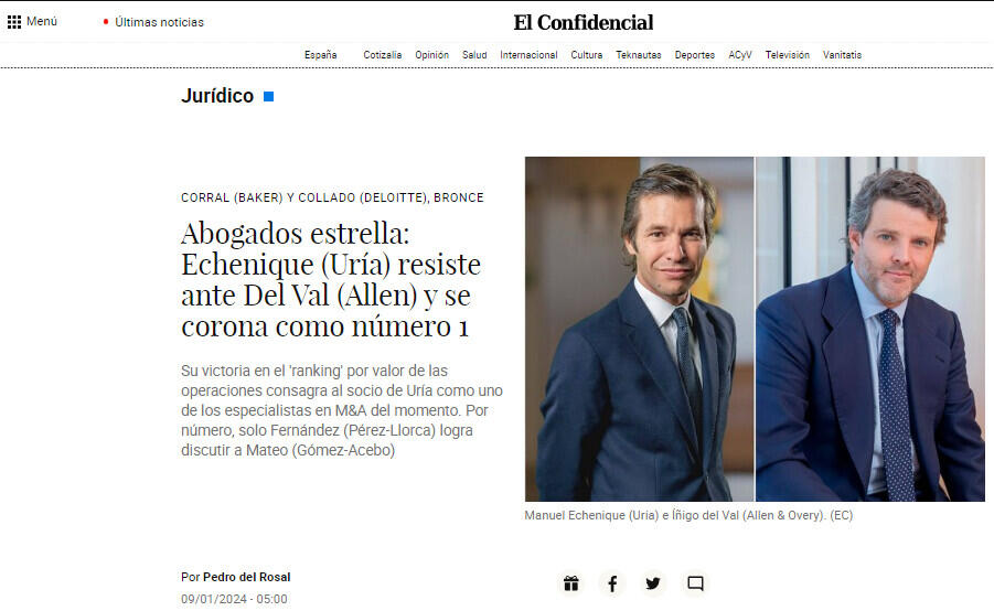 De este modo, Echenique se convierte en el único letrado que clasifica en las diez primeras posiciones en ambos rankings, un mérito que también consiguió en 2022. Es poco habitual concluir un ejercicio en el top 10 de ambas categorías, lo que no solo demuestra una alta capacidad de generación y trabajo, sino también contar con una capacidad técnica que merece la confianza de los clientes para sus grandes operaciones. La victoria del socio de Uría Menéndez, justo por delante de otro peso pesado del M&A como Íñigo del Val, socio de Allen & Overy, certifica que se trata de uno de los especialistas del momento en el ámbito transaccional.