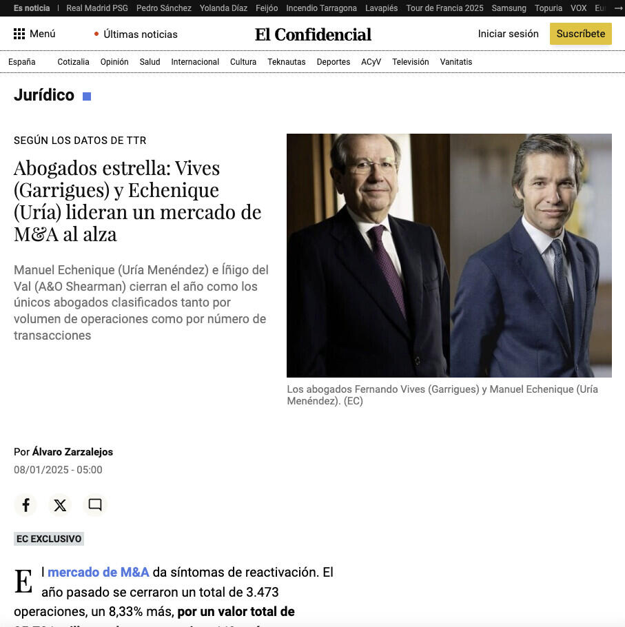 Abogados estrella: Vives (Garrigues) y Echenique (Uría) lideran un mercado de M&A al alza
