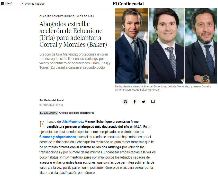 El socio de Uría Menéndez Manuel Echenique presenta su firme candidatura para ser el abogado más destacado del año en M&A. En un ejercicio que está siendo especialmente complicado en el ámbito de las fusiones y adquisiciones, pues el mercado se encuentra bajo mínimos por el coste de la financiación, Echenique ha realizado un gran tercer trimestre que le ha permitido alzarse con el liderato en los dos rankings: por valor de las transacciones y por número de las mismas. Encabezar ambas tablas a la vez es poco habitual y muy meritorio, pues son muy pocos los letrados capaces de asesorar en las grandes transacciones, que son las que permiten subir en la de valor, y, a la vez, participar en un importante número de ellas para pelear por la victoria en la clasificación por número.