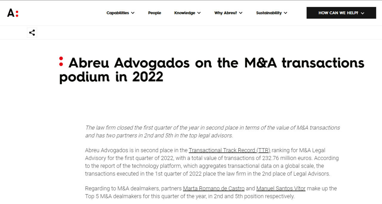 Abreu Advogados is in second place in the Transactional Track Record (TTR) ranking for M&A Legal Advisory for the first quarter of 2022, with a total value of transactions of 232.76 million euros. According to the report of the technology platform, which aggregates transactional data on a global scale, the transactions executed in the 1st quarter of 2022 place the law firm in the 2nd place of Legal Advisors.