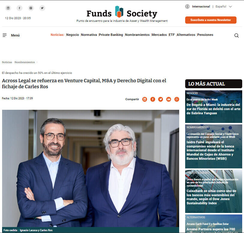 En palabras de Ignacio Lacasa, “Carles es un gran fichaje y estamos encantados de que haya apostado por el proyecto de Across. No es fácil encontrar en el mercado talento sénior como el de Carles, tan conocedor de las empresas emergentes, tan internacional y tan alineado con nuestra forma de entender cómo dar la mejor respuesta a los retos de nuestros clientes en un entorno cada vez más complejo y transnacional. Creo firmemente que los más de 20 años de experiencia en dos vertientes clave para nosotros, como son el venture capital y el derecho digital, van a aportar mucho valor a nuestros clientes nacionales e internacionales y nos permiten apuntalar y afianzar el crecimiento exponencial que estamos viviendo en el despacho”.