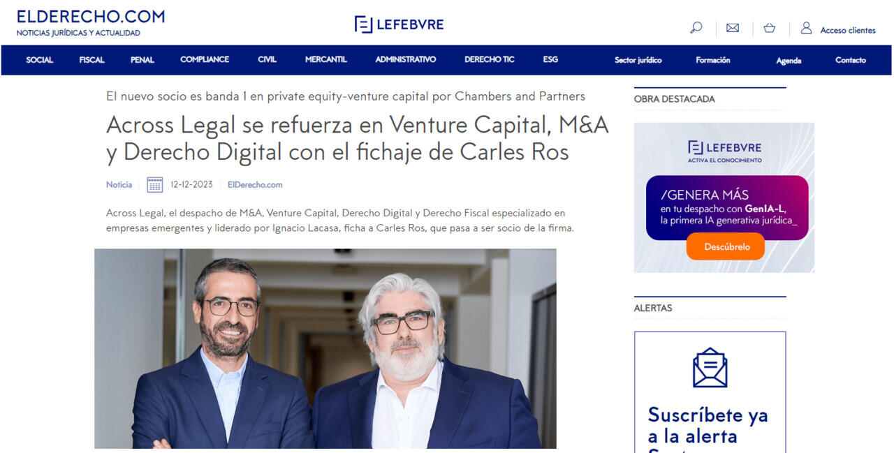 Across Legal, el despacho de M&A, Venture Capital, Derecho Digital y Derecho Fiscal especializado en empresas emergentes y liderado por Ignacio Lacasa, ficha a Carles Ros, que pasa a ser socio de la firma.