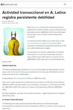 TTR informó que Brasil sigue siendo el país más activo de la región con 453 acuerdos en enero-mayo, si bien la cifra fue 8% menor que en los primeros cinco meses de 2018. Mientras tanto, el importe total declinó 6% a US$25.628mn.