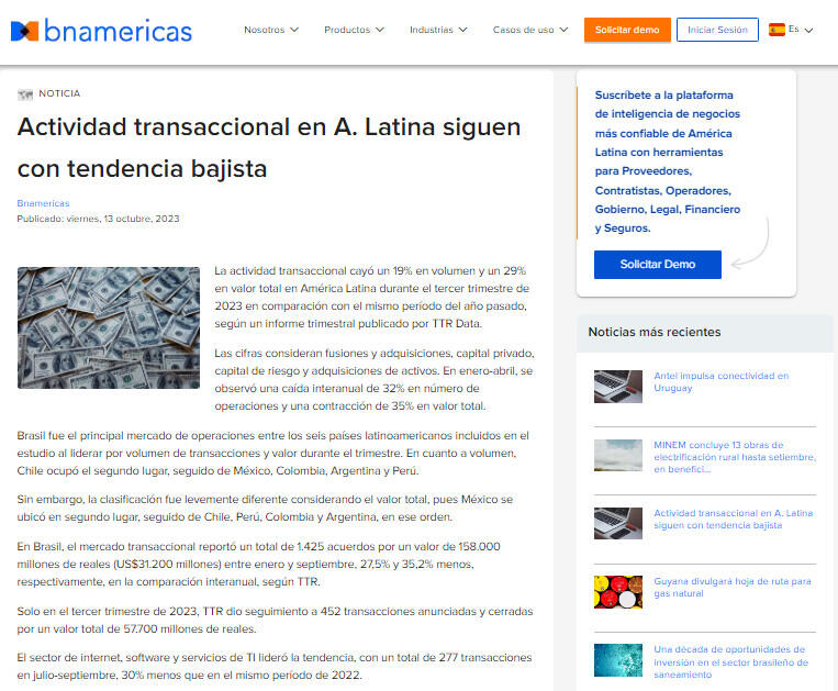 Solo en el tercer trimestre de 2023, TTR dio seguimiento a 452 transacciones anunciadas y cerradas por un valor total de 57.700 millones de reales.