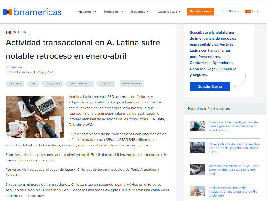 Actividad transaccional en A. Latina sufre notable retroceso en enero-abril