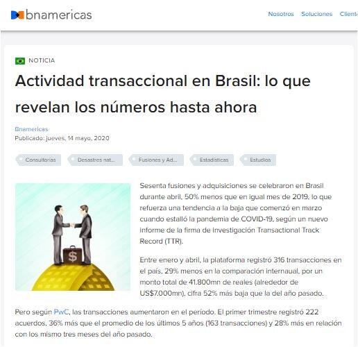 "El mercado transaccional de Brasil también está comenzando a estabilizarse, con volúmenes de negocios que disminuyeron drásticamente durante 2019, pero mucha actividad mantiene ocupados a los asesores mientras continúan aislándose en las oficinas centrales", escribió TTR en su informe sobre Brasil.