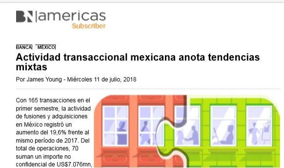 Con 165 transacciones en el primer semestre, la actividad de fusiones y adquisiciones en México registró un aumento del 19,6% frente al mismo período de 2017. Del total de operaciones, 70 suman un importe no confidencial de US$7.076mn, equivalente a un alza interanual de 4,34%. Sin embargo, en un segundo trimestre marcado por la tensa renegociación del TLCAN, la depreciación del peso y la incertidumbre previa a las elecciones presidenciales del 1 de julio, la actividad fue menos dinámica que en el 2T17 con 78 transacciones (+6,85% a/a), 38 de las cuales reportaron un importe no confidencial de US$2.369mn (18,1% a/a), según la firma de investigación Transactional Track Record (TTR). Hablando de la mejora general en México durante la primera mitad del año, Pablo Coballasi, cofundador, socio y director general de PC Capital Partners, proveedor de banca de inversión y servicios de asesoría de fusiones y adquisiciones con sede en Ciudad de México, dijo en entrevista con TTR: "Este incremento en volumen se debe al fuerte dinamismo transaccional de la economía mexicana y a su continuo crecimiento, en especial en los sectores financieros y manufactureros, los cuales continúan creciendo a tasas por arriba del crecimiento de país".
