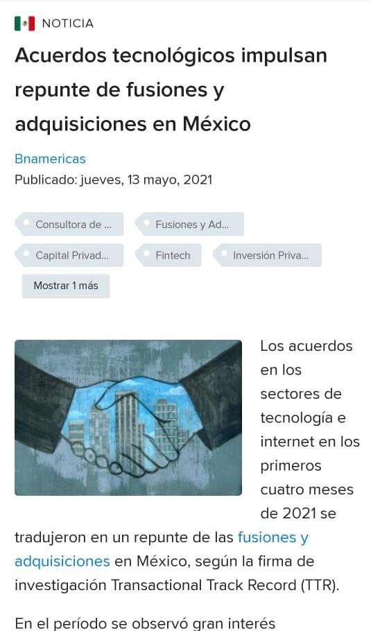 Los acuerdos en los sectores de tecnología e internet en los primeros cuatro meses de 2021 se tradujeron en un repunte de las fusiones y adquisiciones en México, según la firma de investigación Transactional Track Record (TTR).
