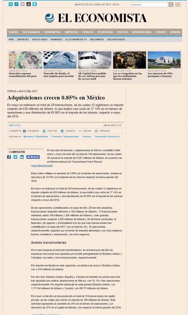 En mayo se realizaron un total de 29 transacciones, de las cuales 12 registraron un importe conjunto de 639 millones de dólares, lo que implicó una caída de 17.14% en el número de operaciones y una disminución de 65.80% en el importe de las mismas, respecto a mayo del 2016.
