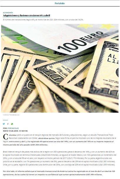 Colombia subió un puesto en el ranquin regional del mercado de fusiones y adquisiciones, según un estudio Transactional Track Record en colaboración con Ontier, ubicándose quinta. Según esta firma, el país ha mostrado uno de los mejores resultados de la región, entre enero y abril, y ha registrado 49 operaciones (un alza del 14%), con un aumento del 15% en su importe respecto al mismo periodo del año pasado (US$1.304 millones).