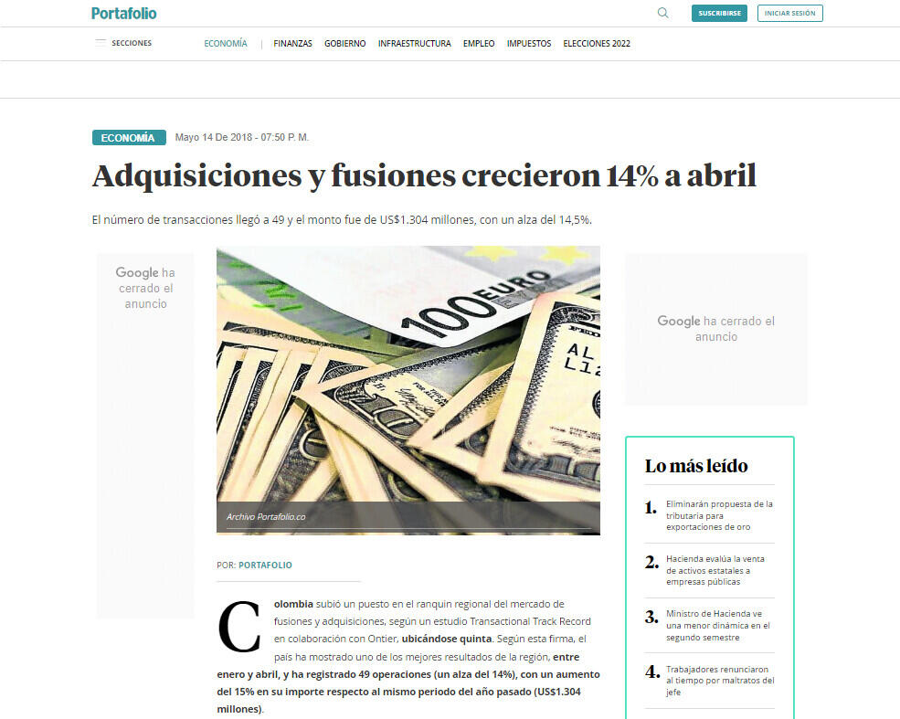 Colombia subió un puesto en el ranquin regional del mercado de fusiones y adquisiciones, según un estudio Transactional Track Record en colaboración con Ontier, ubicándose quinta. Según esta firma, el país ha mostrado uno de los mejores resultados de la región, entre enero y abril, y ha registrado 49 operaciones (un alza del 14%), con un aumento del 15% en su importe respecto al mismo periodo del año pasado (US$1.304 millones).