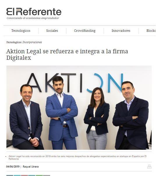 - Aktion Legal ha sido reconocida en 2019 entre los seis mejores despachos de abogados especializados en startups en España por El Referente