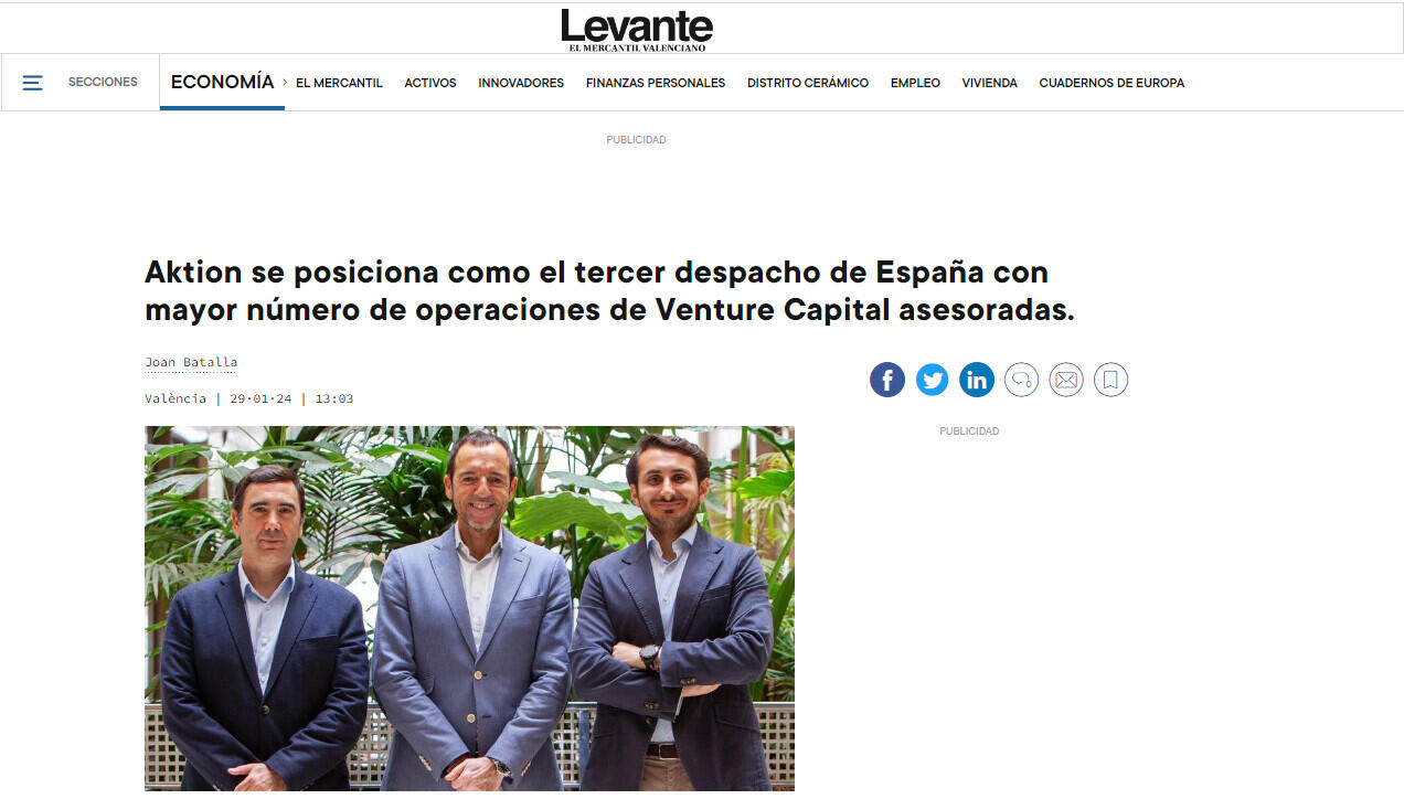 Aktion se posiciona como el tercer despacho de España con mayor número de operaciones de Venture Capital asesoradas.