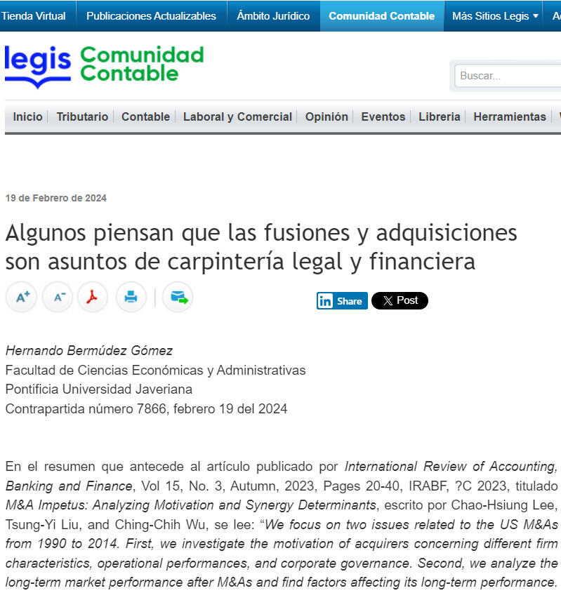En el resumen que antecede al artículo publicado por International Review of Accounting, Banking and Finance, Vol 15, No. 3, Autumn, 2023, Pages 20-40, IRABF, ?C 2023, titulado M&A Impetus: Analyzing Motivation and Synergy Determinants, escrito por Chao-Hsiung Lee, Tsung-Yi Liu, and Ching-Chih Wu, se lee: “We focus on two issues related to the US M&As from 1990 to 2014. First, we investigate the motivation of acquirers concerning different firm characteristics, operational performances, and corporate governance. Second, we analyze the long-term market performance after M&As and find factors affecting its long-term performance. The empirical results show that the acquirer's capital expenditure significantly affects the decision positively. In addition, we also find evidence that horizontal M&As positively impact acquiring firms' long-term performance significantly. This evidence implies that business-related M&As can create synergy. Finally, we find that the higher the major institutional shareholder’s holding percentage, the better its long-term abnormal performance after M&As. In contrast, the higher the major institutional shareholder’s holding density, the worse its long-term abnormal performance after the M&As” La importancia del asunto puede juzgarse analizando este informe: “Según el informe mensual de M&A de TTR Data, el mercado de fusiones y adquisiciones en América Latina ha concluido enero de 2024 con un descenso del 32% en el número de transacciones registradas y del 10% en el capital movilizado, en comparación con el mismo periodo de 2023. De acuerdo con el ranking por países analizados, Brasil lidera en la región tanto en volumen de transacciones como en capital movilizado. Por número de transacciones, sigue Chile, Colombia, México, Perú y Argentina. Por capital movilizado, Colombia toma el segundo puesto, seguido de México, Chile, Argentina y Perú. El informe presenta un análisis completo y correlacional de los subsectores más activos de la región, además de las transacciones más destacadas del ámbito cross-border.” Algunos piensan que las fusiones y adquisiciones son asuntos de carpintería legal y financiera. Pero están equivocados porque son operaciones muy complejas que solo se consolidan tiempo después de su formalización jurídica. Los contadores pueden tener papeles claves en asuntos más allá de la comprobación de la salud financiera, muchas veces llamados due diligence. Es muy importante saber cómo y en cuanto tiempo se podrá lograr una completa integración de las organizaciones, las empresas y los establecimientos. Como también lo es poder estimar los resultados de semejantes operaciones. Quien sabe qué digan los estados financieros comparativos de Hamburguesas El Corral antes y después del cambio de dueño. En su momento se leyó en Portafolio “El crecimiento de la empresa fue tal que la hizo atractiva a los ojos de los inversores, dando como resultado que en 2014 la cadena pasará a las manos del Grupo Nutresa, el conglomerado de procesamiento de alimentos con sede en Medellín, Colombia. La compra superó los $830.000 millones.” Los contadores pueden ser los mejores analistas de las posibles fusiones o adquisiciones, si abordan el estudio desde las competencias de la contabilidad administrativa. Menos cumplimiento más reflexión económica debe preocuparnos.