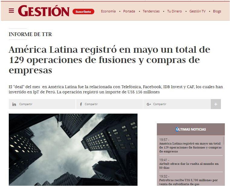 Pero fue Perú el país que tuvo el "deal" del mes. TTR indicó que la operación destacada en América Latina la relacionada con Telefónica, Facebook, IDB Invest y CAF, los cuales han invertido en IpT de Perú. La operación, que ha registrado un importe de US$ 156 millones, ha estado asesorada por GarriguesPerú ; Clifford Chance US;DLA Piper Pizarro Botto Escobar ; Estudio Echecopar; y Rebaza, Alcázar & De Las Casas. Por la parte financiera, la operación ha estado asesorada por Macroinvest - Grupo Macro.