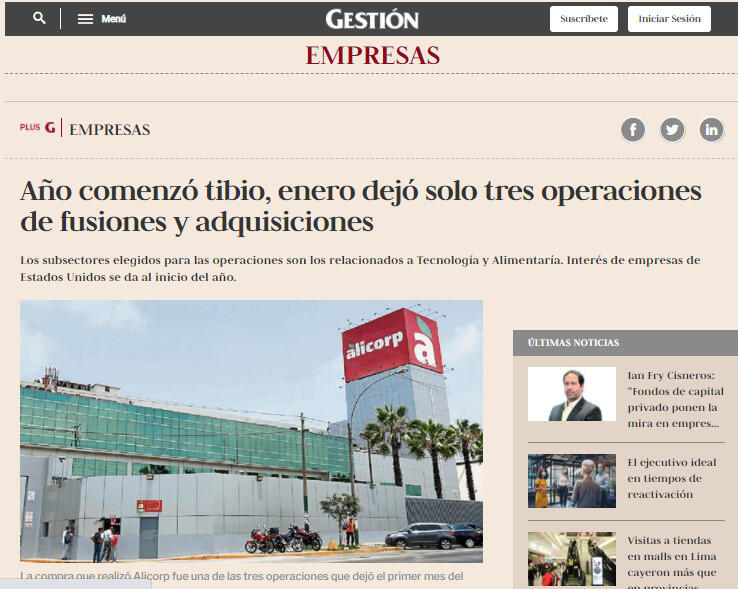 El año arrancó y según el último balance que hace Transactional Track Record (TTR) el mes de enero ha dejado solo tres operaciones, diez menos de las que se dieron en enero del año pasado, en un momento en el que la pandemia del covid-19 se acercaba al país. Cabe recordar que en diciembre del año pasado, el mercado de fusiones y adquisiciones reportó 10 operaciones. En cuanto a valor movilizado, TTR no ha recibido los montos que se han dado en estos procesos, los cuales se han enfocado en los subsectores de Tecnología y Alimentaria. Dando una mirada a lo que se generó, el interés de empresas estadounidenses adquiriendo empresas peruanas se hace presente en el mes de enero, al darse una transacción de este tipo. Asimismo, otra de las operaciones fue parte de extranjeros que ponen la mira en los sectores de tecnología e internet. Una de ellas viene por parte de extranjeros. Según la data de TTR, una de las operaciones que se cerró casi al cierre de enero fue la que reportamos (Gestión 03.02.2021) de Alicorp sobre el 100% de las acciones de Vegetalia, con sede en Lurín, empresa que se dedica a la fabricación y comercialización de productos alimentarios hechos con ingredientes vegetales, entre ellos productos oleoginosos como la manteca y margarina. En dicha transacción, Vegetalia fue asesorado por UNE Asesores, según TTR . Otra de las operaciones fue la ejecutada por American Tower, empresa estadounidense de telecomunicaciones que acordó la adquisición de la división de torres de telecomunicaciones de Telxius en Latinoamérica (Telefónica), entre ellas Perú. En tanto, la otra fue la de TCS Chile, controlada por Tata Group, que vendió Technology Outsourcing con sede en Lima, a Banco Pichincha, y que es una empresa que se dedica a la programación y suministros informáticos. El importe de la operación no se ha desvelado. Todas estas operaciones han sido del tipo M&A (fusiones y adquisiciones), y no se ha reportado adquisición de activos, private equity o venture capital (capital de riesgo). Y para los siguientes meses la tendencia que se verá dentro de las empresas sería el ir tras deuda privada, para poder crecer, según Alfredo Zamudio, CEO de Tudor & Grey Capital Las que están llegando a nosotras, fuera de los “deals” que están pendientes por salir son del sector de ingeniería y construcción que van tras capital de trabajo. “Hay órdenes de compra y requerimiento, y por cuestiones de demanda del mercado van tras deuda privada, esencialmente”, dice el ejecutivo. Una de las líneas con las que trabajan dentro de Tudor & Grey es la de financiamiento, por ello, lo que están viendo ahora es que las empresas que buscan ese capital de trabajo son relacionadas al rubro minero. “Algunas son de exportación de minerales, por ejemplo, y buscamos que alcancen las opciones para poder vender en el exterior, como factoring internacional”,precisó. El dato Opciones. El radar de TTR, que mide las expectativas para los próximos seis meses, en cuanto a lo que traerá el mercado, muestra que la expansión de negocios será un punto relevantes, pero así también lo referente al interés de compañías que quieren comprar
