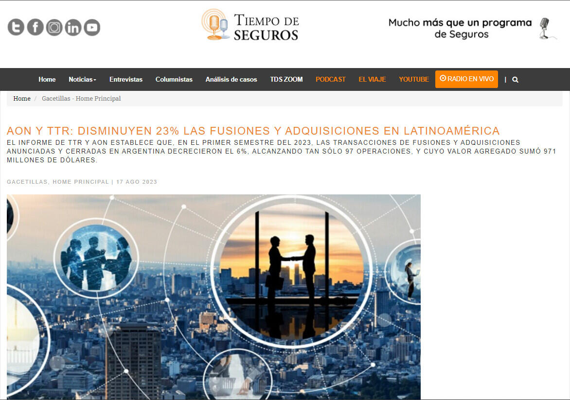 Aon plc (NYSE: AON), firma líder mundial en servicios profesionales, dio a conocer que el primer semestre de 2023 el mercado de fusiones y adquisiciones (M&A, por sus siglas en inglés), de América Latina retrocedió 23% en comparación con el mismo periodo del 2022 al registrar un total de 1.447 transacciones entre anunciadas y cerradas, que representaron un importe agregado de 35.671 millones de dólares, según el informe de TTR y Aon.