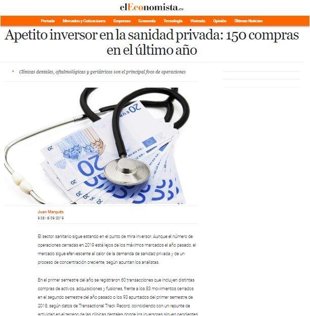 En el primer semestre del año se registraron 60 transacciones que incluyen distintas compras de activos, adquisiciones y fusiones, frente a los 83 movimientos cerrados en el segundo semestre del año pasado o los 93 apuntados del primer semestre de 2018, según datos de Transactional Track Record, coincidiendo con un repunte de actividad en el terreno de las clínicas dentales donde los inversores siguen pendientes de la venta de la cadena Vivanta. "Son menos operaciones pero el mercado no se ha enfriado, la inversión sigue siendo atractiva en el medio y largo plazo", sostiene Francisco Sevilla Perete, director en Strategy&, el equipo de consultoría estratégica de PwC.