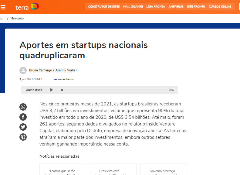 Nos cinco primeiros meses de 2021, as startups brasileiras receberam US$ 3,2 bilhões em investimentos, volume que representa 90% do total investido em todo o ano de 2020, de US$ 3,54 bilhões. Até maio, foram 261 aportes, segundo dados divulgados no relatório Inside Venture Capital, elaborado pelo Distrito, empresa de inovação aberta. As fintechs atraíram a maior parte dos investimentos, embora outros setores venham ganhando importância nessa conta.