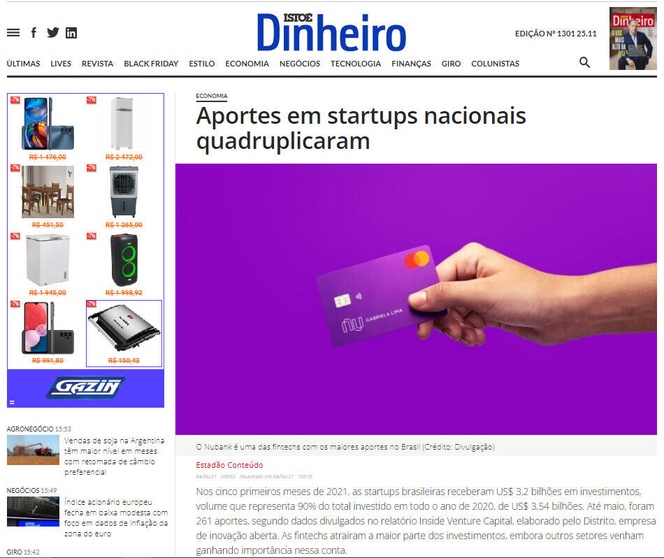 Nos cinco primeiros meses de 2021, as startups brasileiras receberam US$ 3,2 bilhões em investimentos, volume que representa 90% do total investido em todo o ano de 2020, de US$ 3,54 bilhões. Até maio, foram 261 aportes, segundo dados divulgados no relatório Inside Venture Capital, elaborado pelo Distrito, empresa de inovação aberta. As fintechs atraíram a maior parte dos investimentos, embora outros setores venham ganhando importância nessa conta.