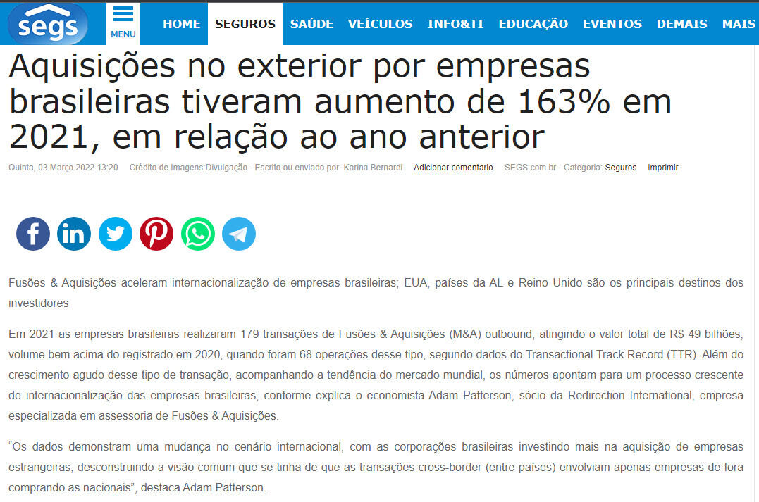 Em 2021 as empresas brasileiras realizaram 179 transações de Fusões & Aquisições (M&A) outbound, atingindo o valor total de R$ 49 bilhões, volume bem acima do registrado em 2020, quando foram 68 operações desse tipo, segundo dados do Transactional Track Record (TTR). Além do crescimento agudo desse tipo de transação, acompanhando a tendência do mercado mundial, os números apontam para um processo crescente de internacionalização das empresas brasileiras, conforme explica o economista Adam Patterson, sócio da Redirection International, empresa especializada em assessoria de Fusões & Aquisições.