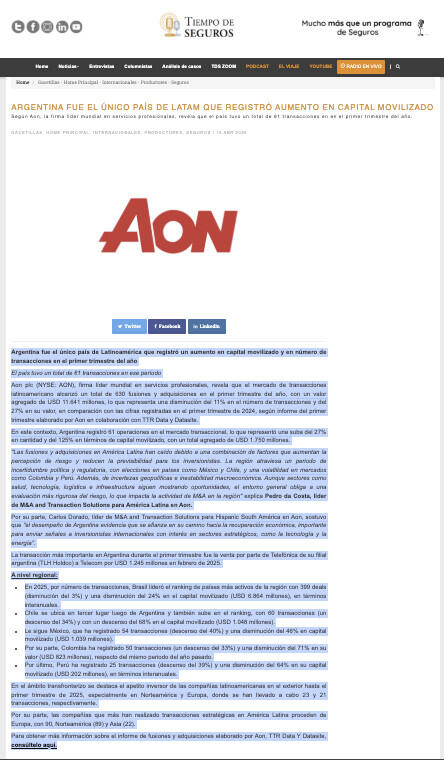 Para obtener más información sobre el informe de fusiones y adquisiciones elaborado por Aon, TTR Data Y Datasite, consúltelo aquí.