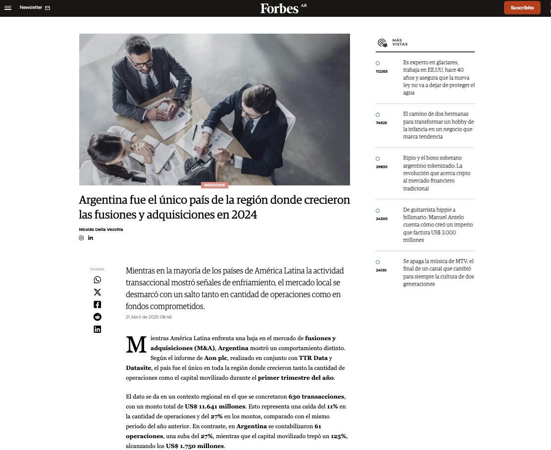 Mientras América Latina enfrenta una baja en el mercado de fusiones y adquisiciones (M&A), Argentina mostró un comportamiento distinto. Según el informe de Aon plc, realizado en conjunto con TTR Data y Datasite, el país fue el único en toda la región donde crecieron tanto la cantidad de operaciones como el capital movilizado durante el primer trimestre del año.