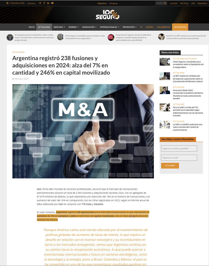 Aon, firma líder mundial en servicios profesionales, anunció que el mercado de transacciones latinoamericano alcanzó un total de 2.904 fusiones y adquisiciones durante 2024, con un agregado de 87.679 millones de dólares, lo que representa una reducción del 16% en el número de transacciones y un aumento del valor del 16% en comparación con las cifras registradas en 2023, según el informe anual de M&A elaborado por Aon en conjunto con TTR Data y Datasite.