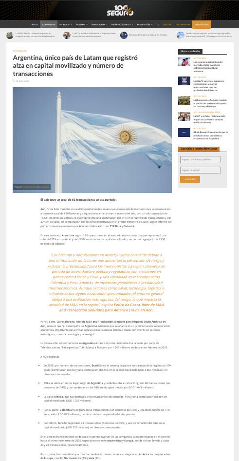 Por su parte, Carlos Dorado, líder de M&A and Transaction Solutions para Hispanic South América en Aon, sostuvo que “el desempeño de Argentina evidencia que se afianza en su camino hacia la recuperación económica, importante para enviar señales a inversionistas internacionales con interés en sectores estratégicos, como la tecnología y la energía”.