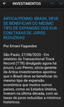 Em relatório da Transactional Track Record (TTR) divulgado agora há pouco, Luiz Penno, sócio-gerente da Ártica Investimentos apontou que o Brasil deve se beneficiar do mesmo tipo de expansão econômica que muitos outros países, como os Estados Unidos, tiveram na última década, com as taxas de juros reduzidas a mínimos históricos.