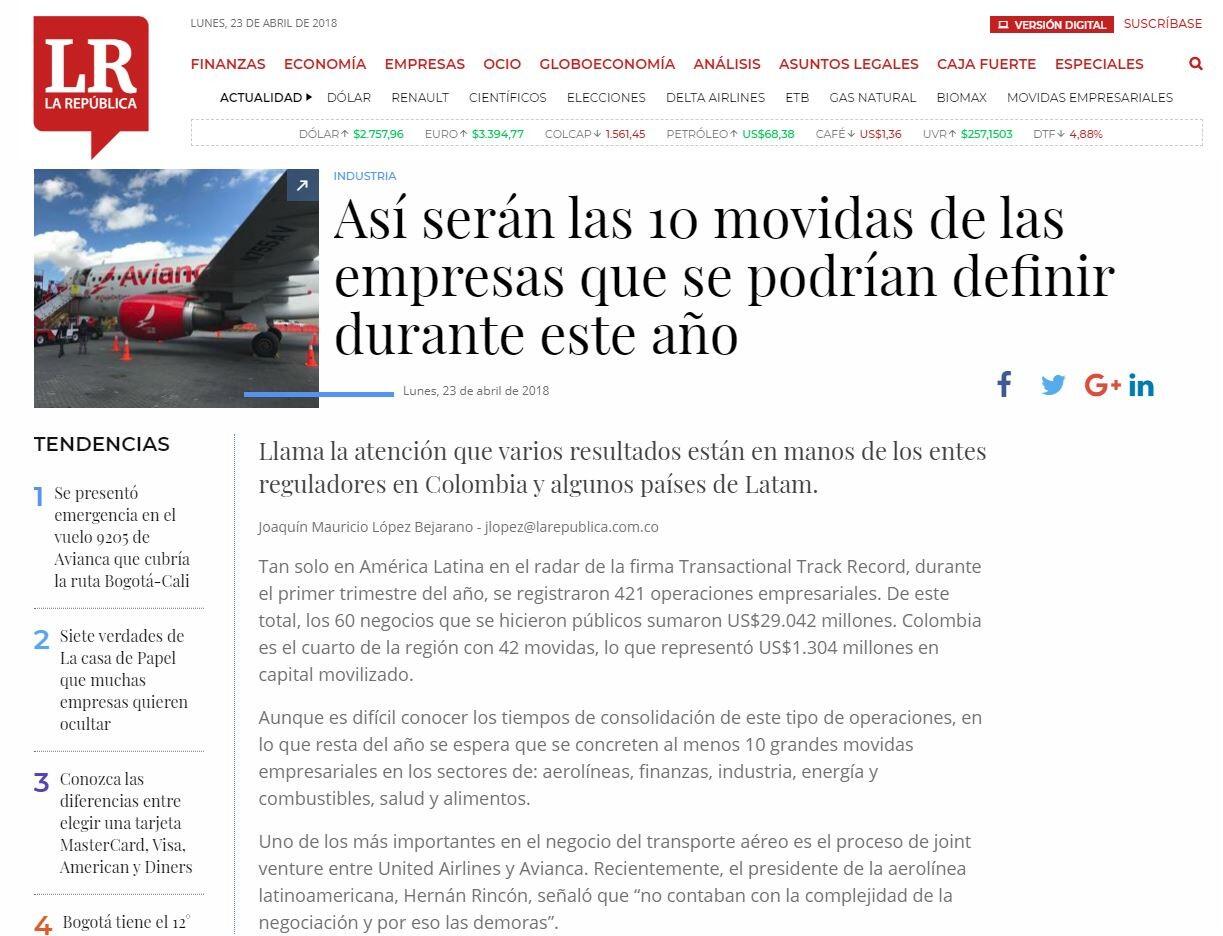“El mercado de fusiones y adquisiciones en Colombia ha cerrado el primer trimestre de 2018 con un mayor dinamismo”.