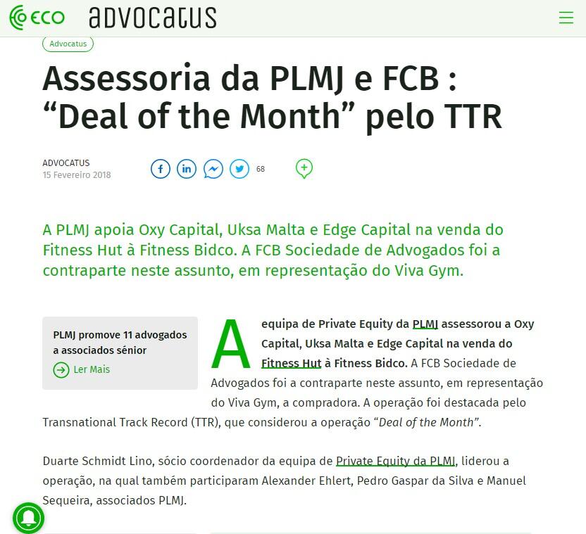 A equipa de Private Equity da PLMJ assessorou a Oxy Capital, Uksa Malta e Edge Capital na venda do Fitness Hut à Fitness Bidco. A FCB Sociedade de Advogados foi a contraparte neste assunto, em representação do Viva Gym, a compradora. A operação foi destacada pelo Transnational Track Record (TTR), que considerou a operação “Deal of the Month”.