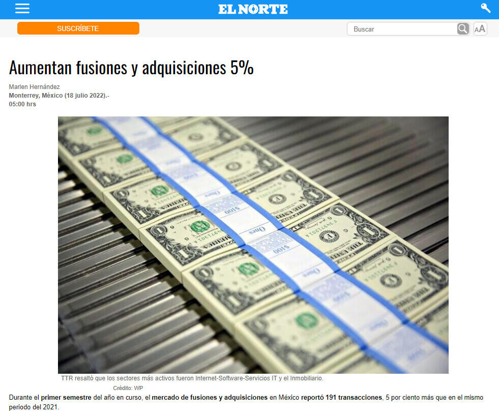 Durante el primer semestre del año en curso, el mercado de fusiones y adquisiciones en México reportó 191 transacciones, 5 por ciento más que en el mismo periodo del 2021.