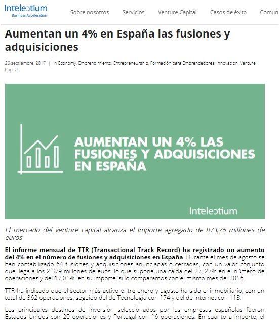 El informe mensual de TTR (Transactional Track Record) ha registrado un aumento del 4% en el número de fusiones y adquisiciones en España. Durante el mes de agosto se han contabilizado 64 fusiones y adquisiciones anunciadas o cerradas, con un valor conjunto que llega a los 2.379 millones de euos, lo que supone una caída del 27, 27% en el número de operaciones y del 17,01% en su importe, si lo comparamos con el mismo mes del 2016.