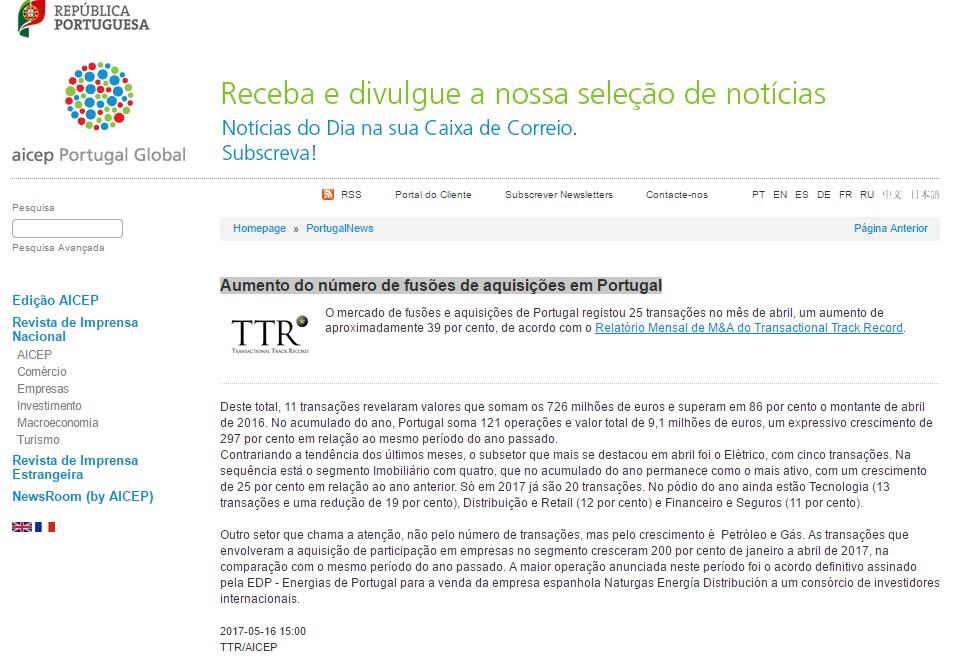 Deste total, 11 transações revelaram valores que somam os 726 milhões de euros e superam em 86 por cento o montante de abril de 2016. No acumulado do ano, Portugal soma 121 operações e valor total de 9,1 milhões de euros, um expressivo crescimento de 297 por cento em relação ao mesmo período do ano passado.