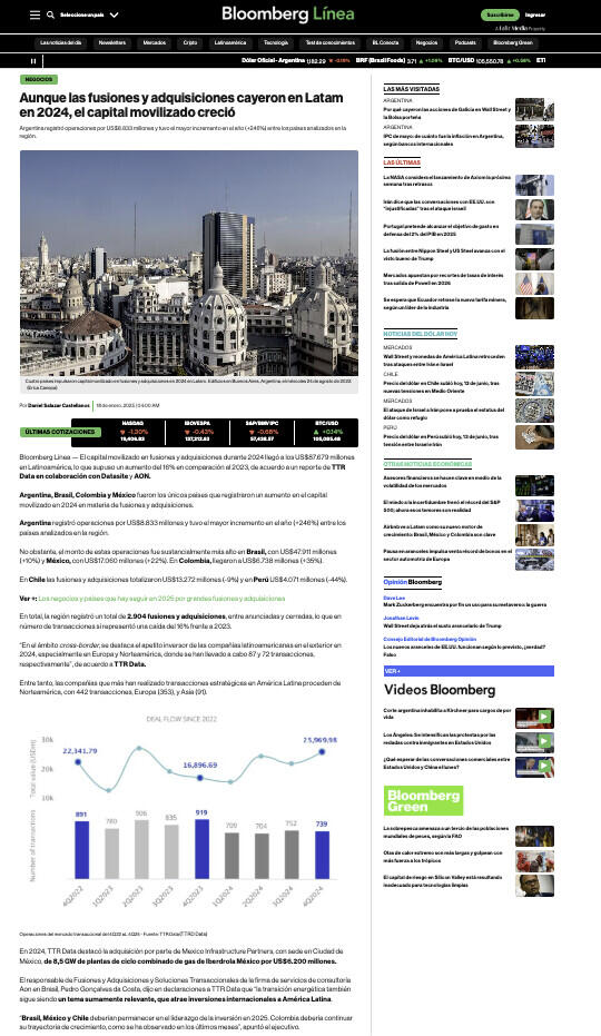 El capital movilizado en fusiones y adquisiciones durante 2024 llegó a los US$187.071 millones en América Latina, un incremento del 6,5% con respecto a lo reportado en 2023, de acuerdo con un reporte de TTR Data en colaboración con Datasite y AON.